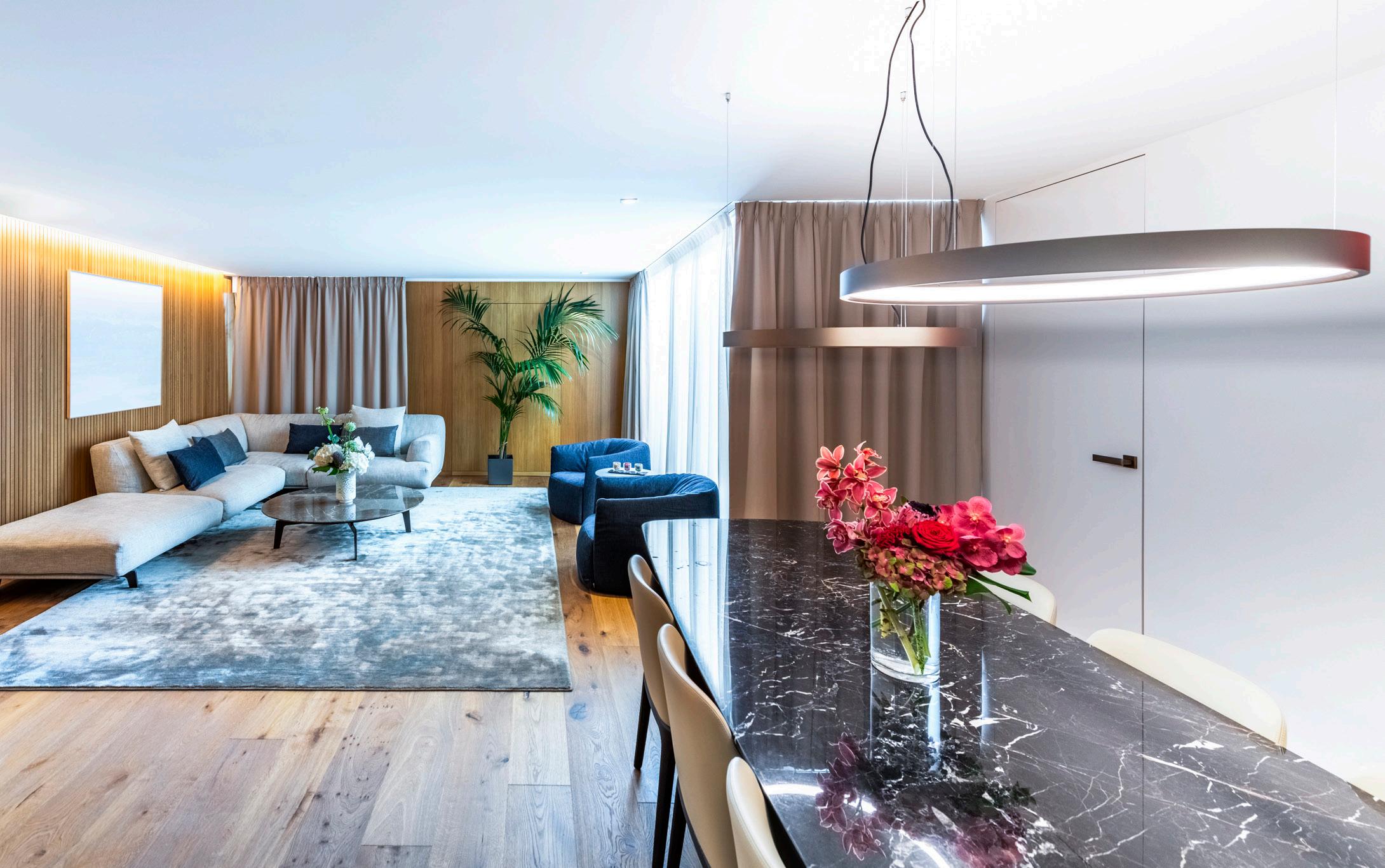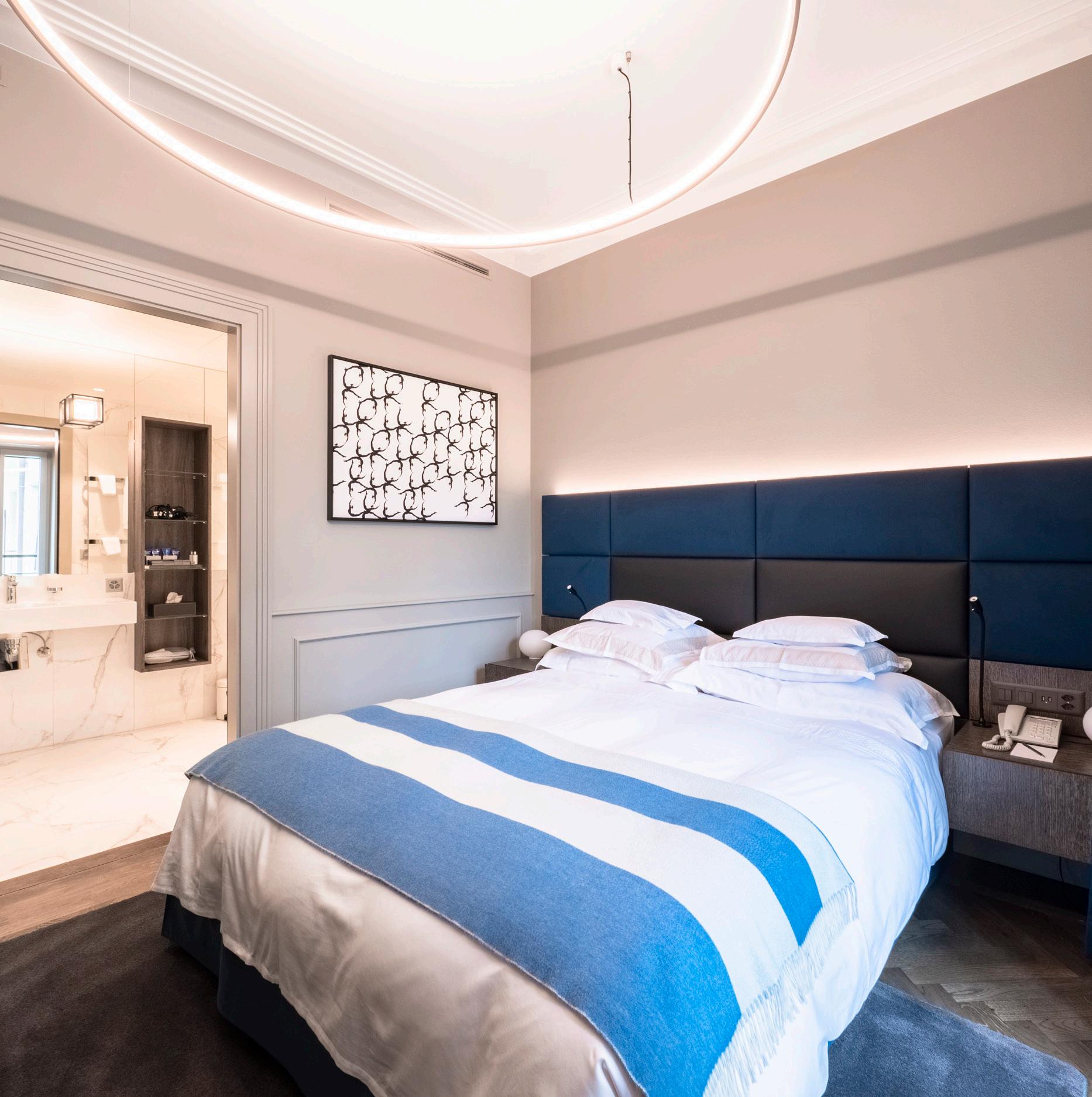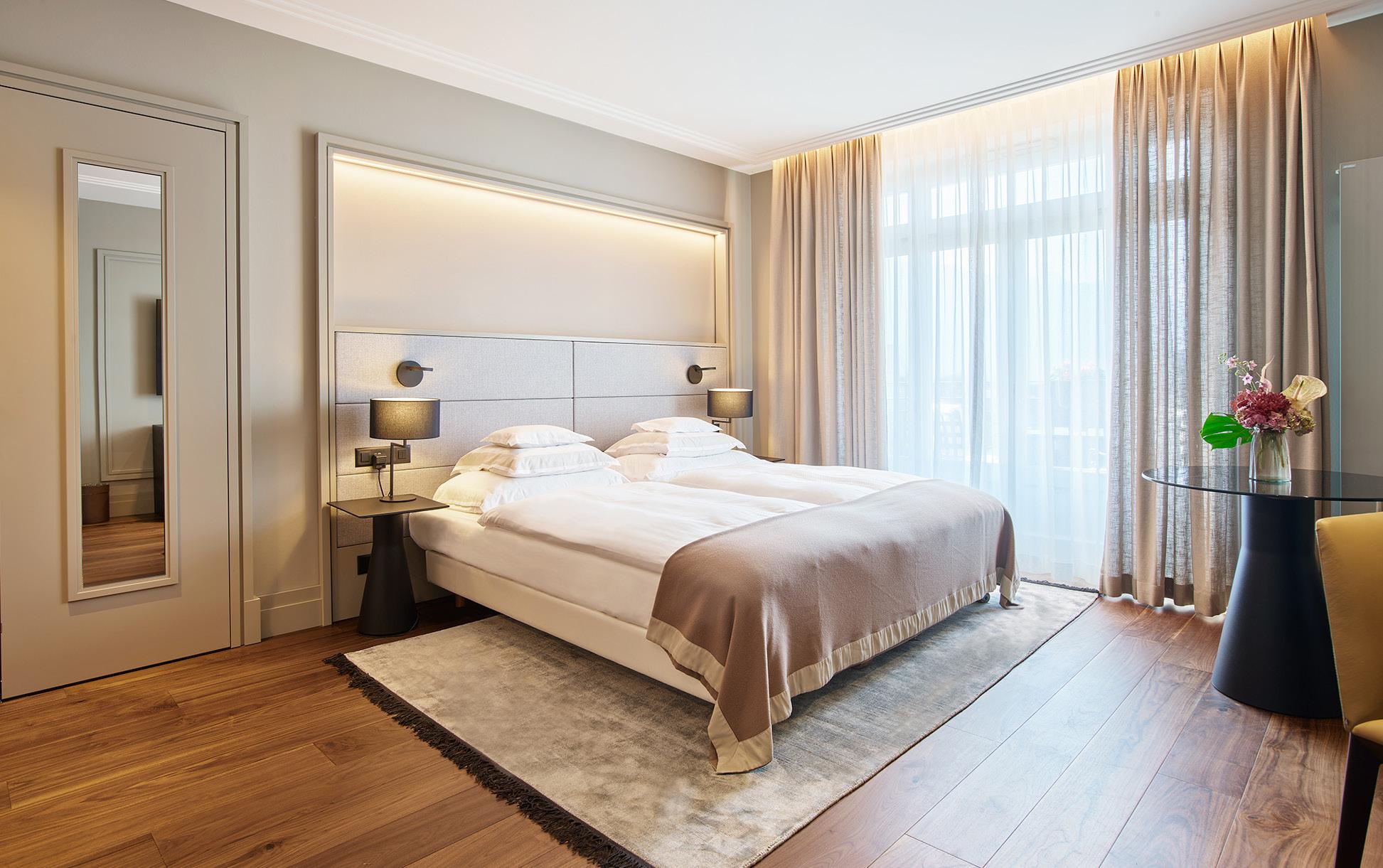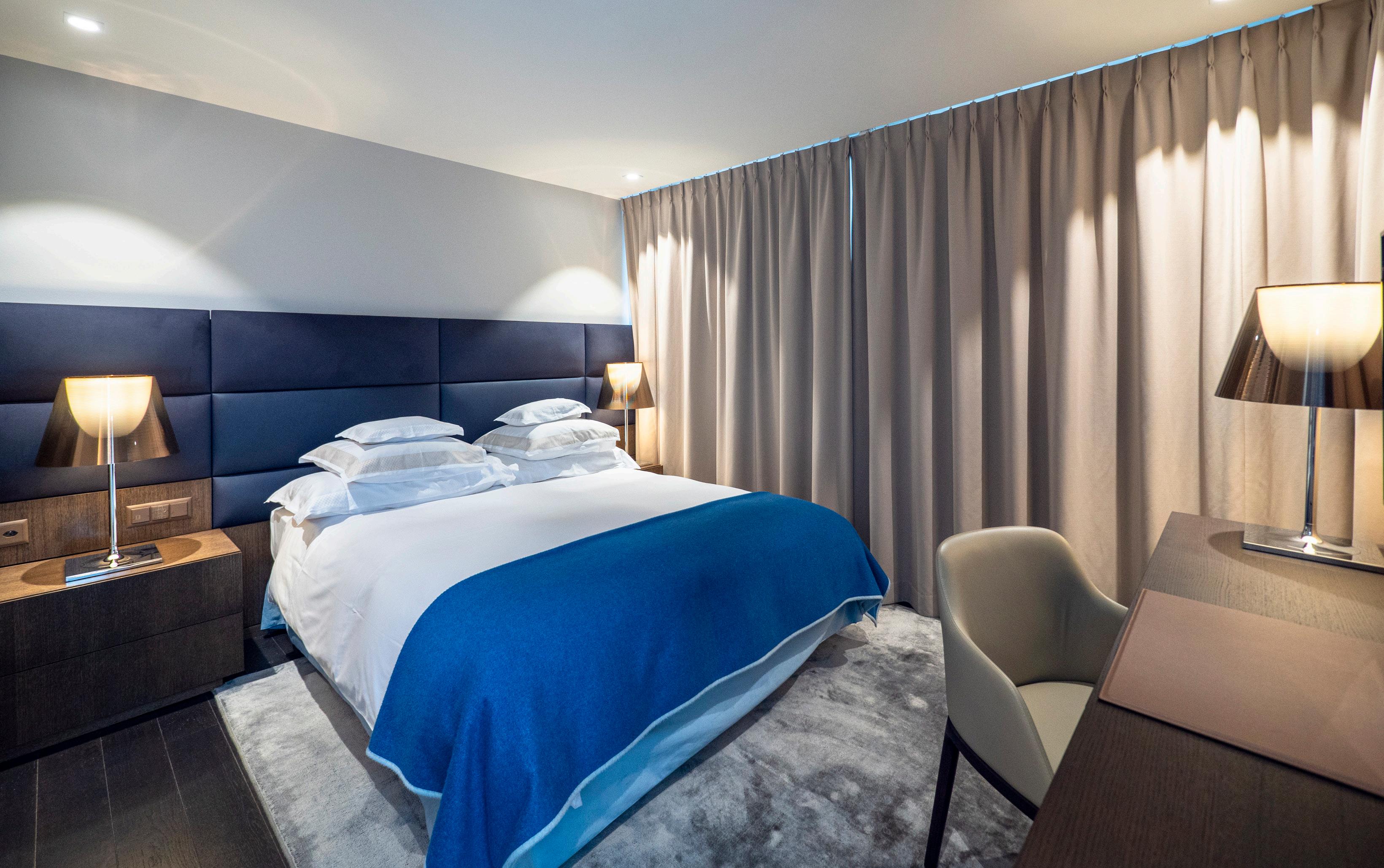 Modern furniture in tones of blue and green inspired by Lac Léman. These spacious rooms offer a superb view of the lake and Alps.