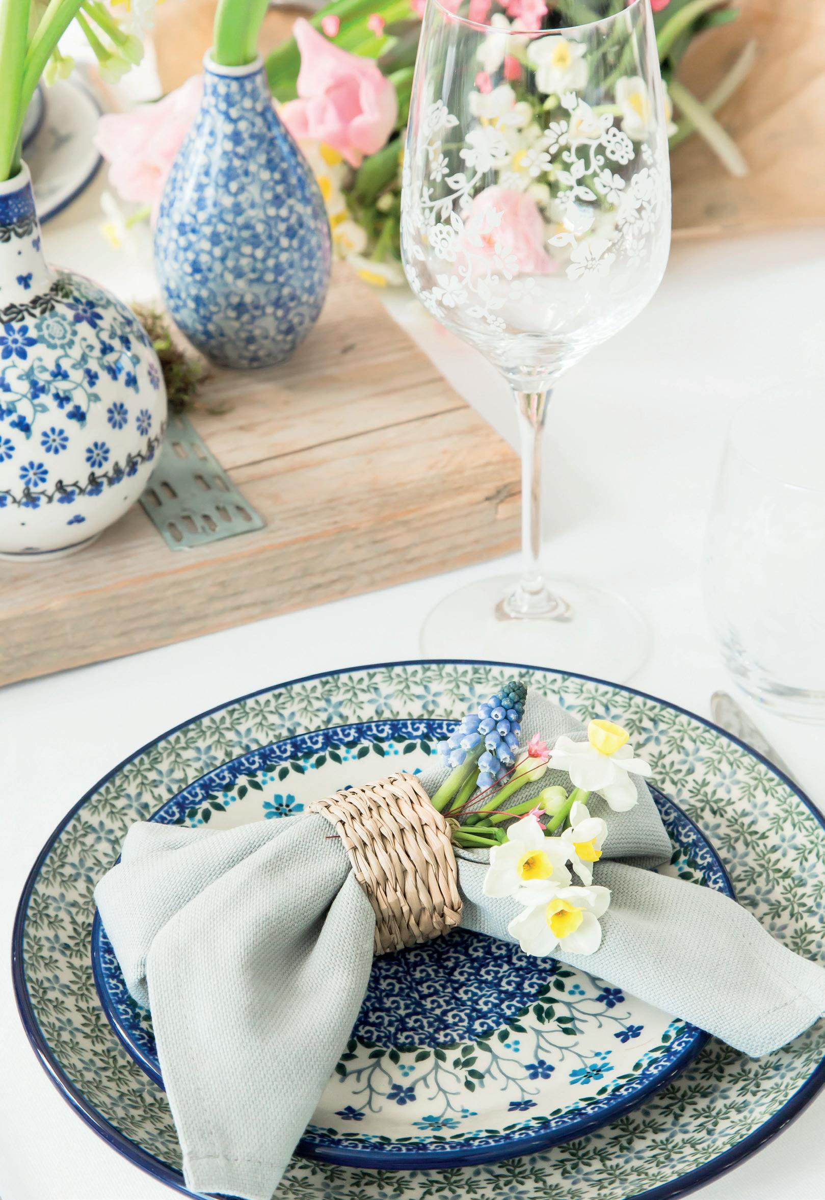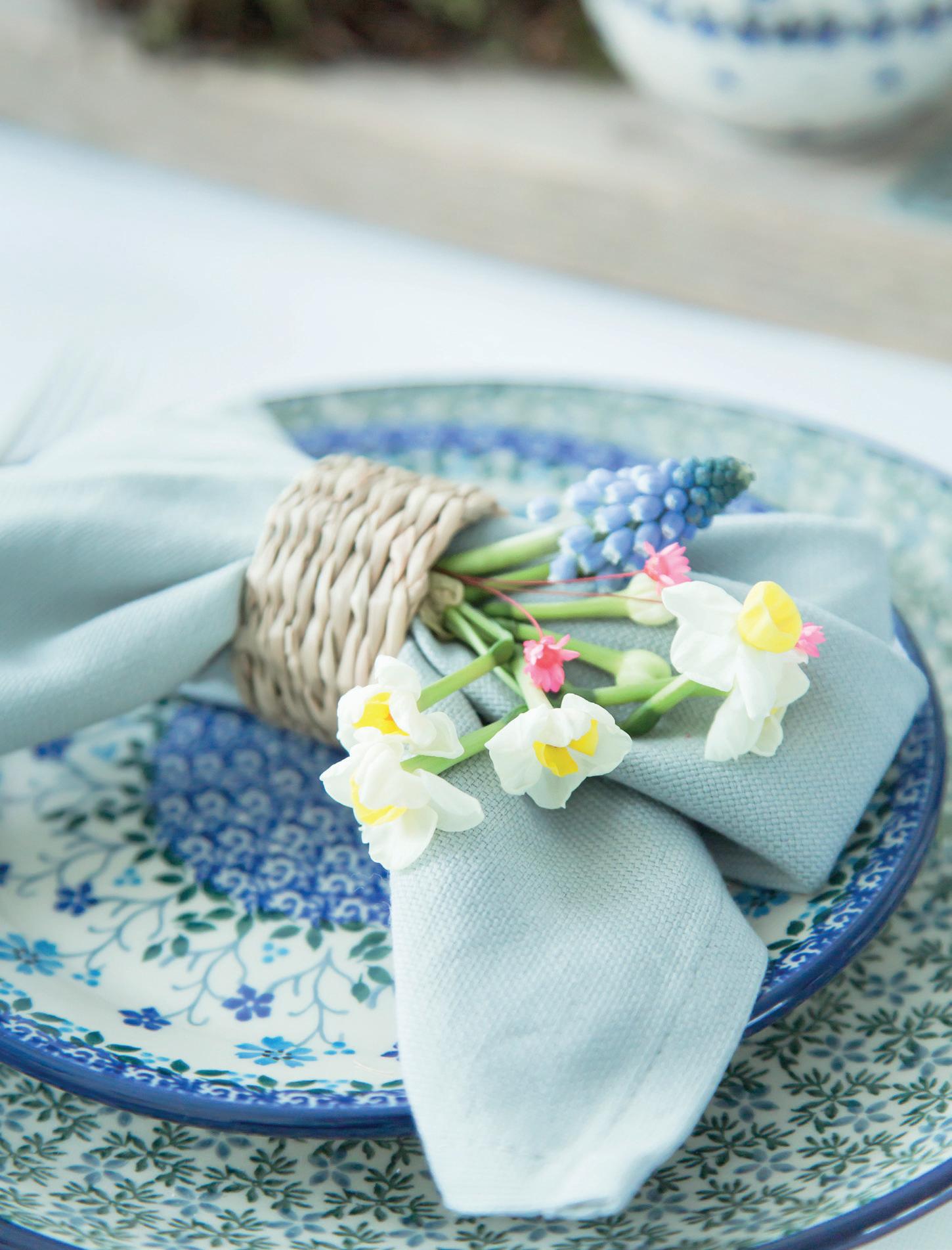 “It’s all in the details”. Vouw of rol de servetten in een mooie vorm en doe daar een servetring of lint omheen. Steek de overige bloemen bij je servetten tussen de servetring. Zo voer je het vrolijke lente thema door over de gehele tafel.