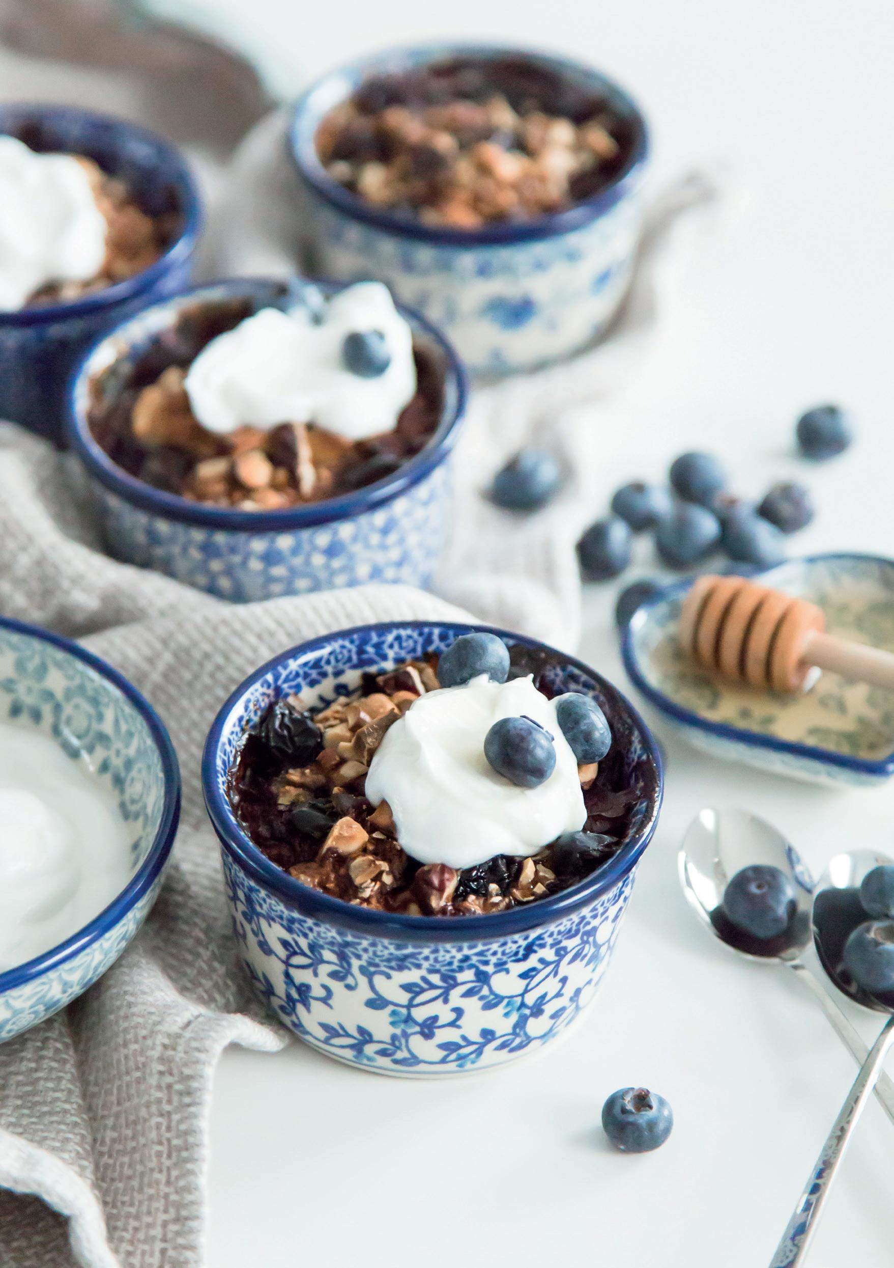 • Plaats 20-25 min in de oven. Serveer de ontbijtjes met een lepel (plantaardige) yoghurt, verse blauwe bessen en nootjes. Om het helemaal feestelijk te maken kun je er nog een klein beetje honing over gieten.