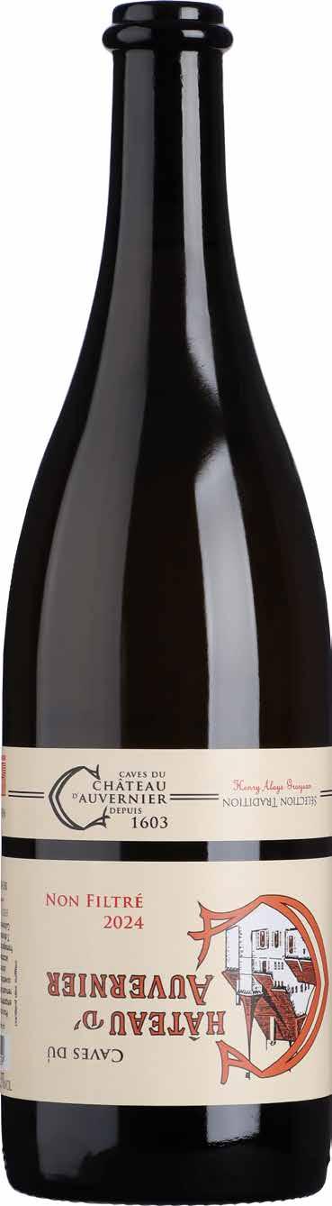 Der Non Filtré 2025 der Caves du Château d’Auvernier zeigt einen grosszügigen Chasselas mit Zitrus- und Grapefruitnoten, getragen von einer feinen Perlage und der Fülle der Hefe. Das auf dem Kopf stehende Etikett? Ein augenzwinkernder Hinweis auf seinen ungefilterten Charakter und eine Einladung, die Flasche vor dem Genuss behutsam zu wenden.
