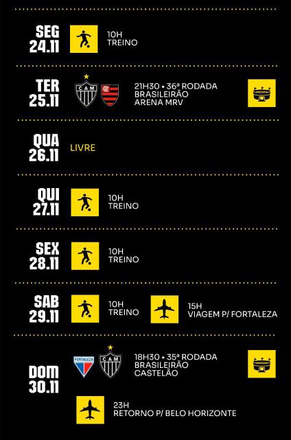 • Depois da partida de hoje, o Atlético terá mais três compromissos no Brasileirão para fechar a temporada: Fortaleza (fora), e duas partidas em casa - Palmeiras e Vasco da Gama