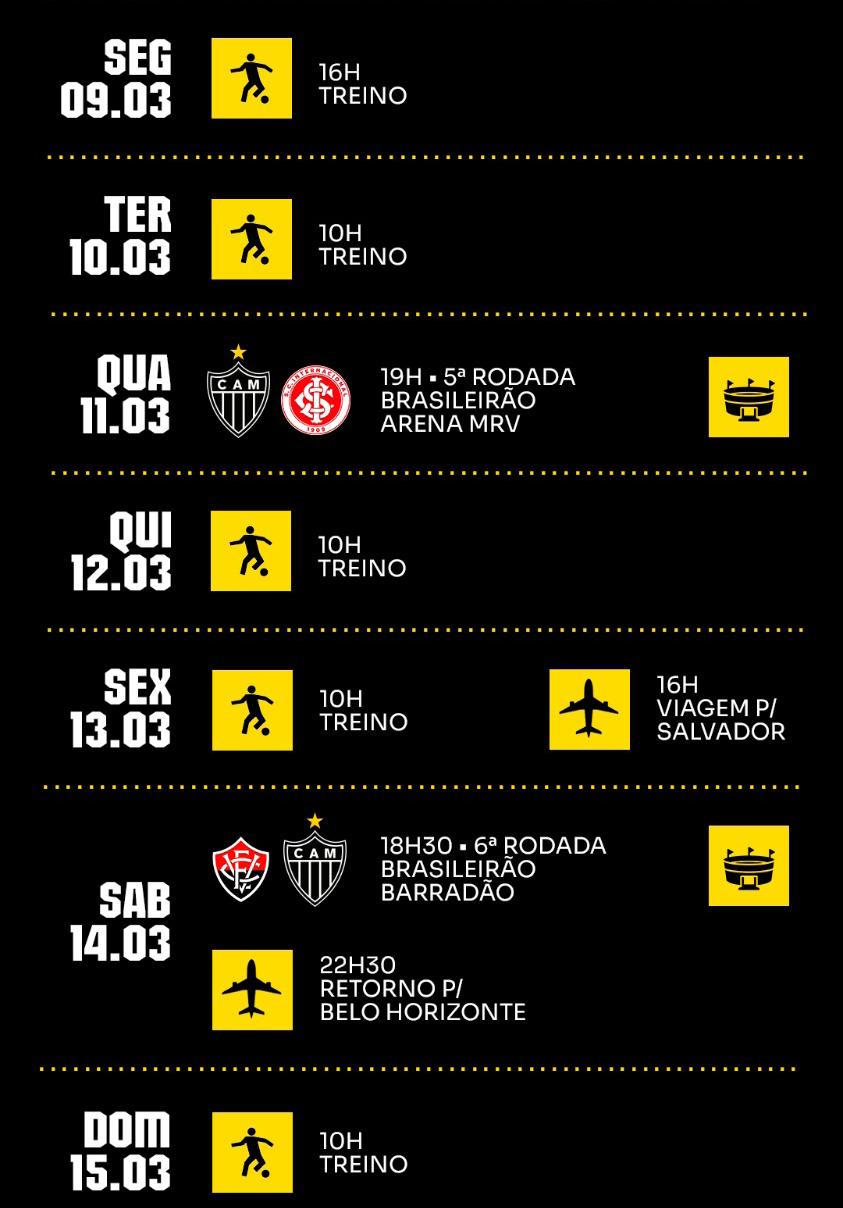 • O Atlético enfrenta o Internacional na Arena MRV, pela 5ª rodada do Campeonato Brasileiro 2026. O Galo está em 17º lugar, com 2 pontos.