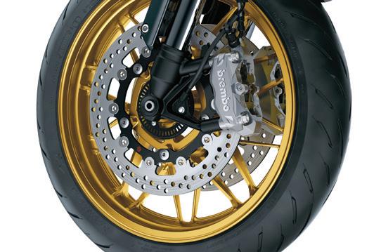 Dual semi-floating 330 mm Brembo discs. Caliper: Dual radial-mount, Brembo Stylema monobloc, opposed 4-piston