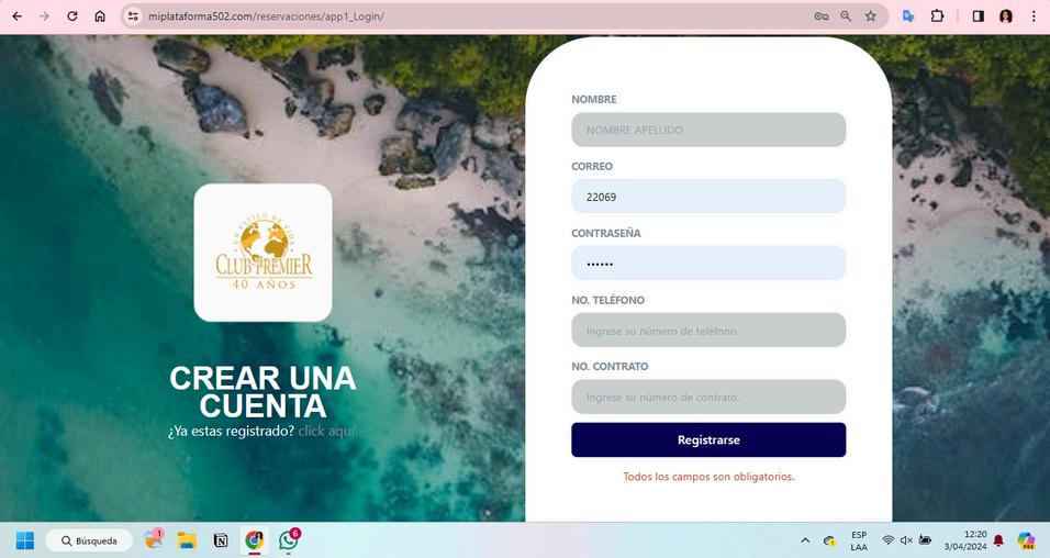 Haz clic en el botón Registrar e introduce tus credenciales como nombre, correo electrónico, contraseña, número de teléfono y número de contrato ( dato proporcionado por el Club Premier).