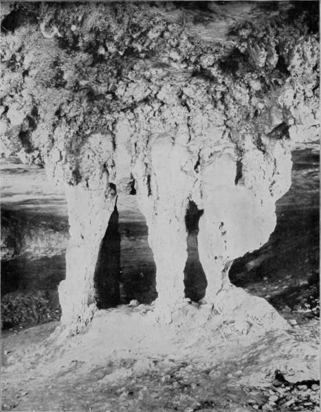 The Bridal Altar is one of the most magnificent spectacles of Mammoth Cave, with its frosted pillars of pearlwhite and the convolutions of their magnificent pediments that may be likened to clouds in the sky of the cave. These vertical shafts or petrified columns are among the most surprising and beautiful features of cave scenery, and when brilliantly lighted they present a scene of splendor surpassing the utmost stretch of the imagination. Let us not, therefore, wonder that this is a favorite resort for young married people, who come hither in the rosy blush of their