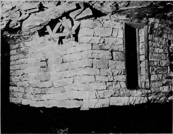 The entrance to Mammoth Cave is arched by a rock-span of seventy feet, thence leading by an easy descent down a winding flight of stone steps to a narrow passage through which the air rushes outward with great force in summer and is drawn inward with corresponding violence during the winter, a phenomenon due to the inequality of temperature between the air inside and out of the Cave, for the temperature of the Cave is uniformly 54° Fahrenheit at all times. The atmosphere being thus constantly agitated, is kept constantly pure, for while the lower levels are moist, being no doubt connected with Green River, the upper avenues and galleries are always dry; conditions which were one time thought to be particularly favorable to consumptives, as well as to those suffering from other wasting diseases. The experiment was therefore made, some forty years ago, of building thirteen stone houses at a point one mile within the Cave, in which a number of invalids took up their domicile and lived there in deep seclusion until it was demonstrated that whatever might be the salubrity of the atmosphere, consumptives derived no benefit from it, a number dying in the Cave. Relics of two of these stone huts still remain, but they exist now only as curiosities, no one having spent a night in one of them for many years.