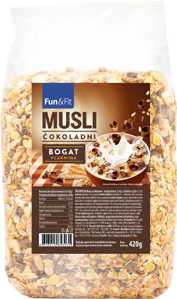 Fun&Fit čokoladni musli je hrskava mješavina žitarica i čokolade, idealna za ukusan i zasitan doručak ili užinu. Sastoji se od raznih pahuljica i čokoladnih dodataka koji daju slatki okus, a može se poslužiti s mlijekom, jogurtom ili biljnim napicima.