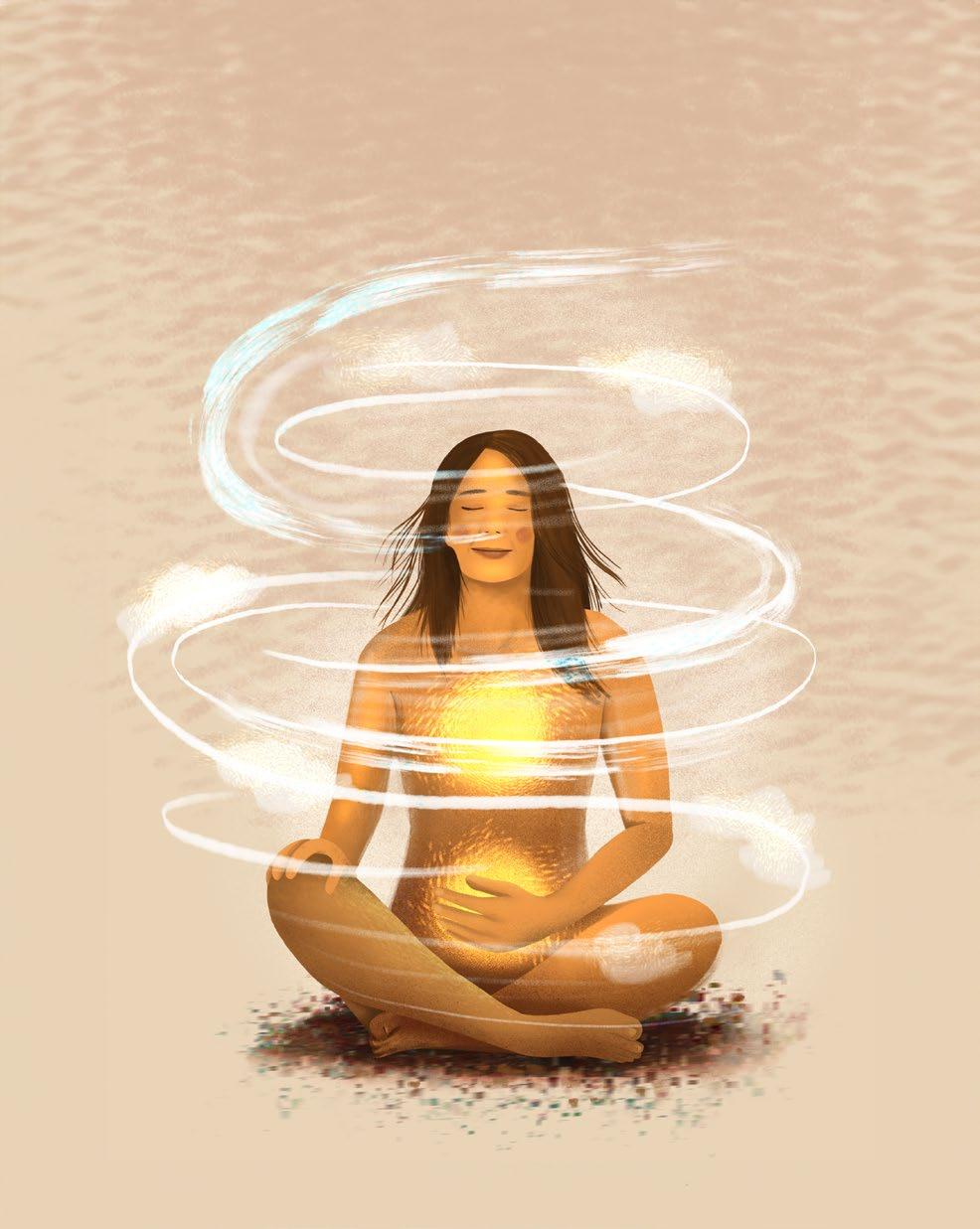 Van Diest: ‘Als je angstig of gestrest bent, adem je vaak sneller en oppervlakkiger. Je kan dit tegengaan door bewust traag en diep te ademen. Adem rustig in door je neus en adem vanuit je buik. Als je langzaam uitademt, vertraagt je hartslag. Dit stimuleert je parasympatisch zenuwstelsel, het deel van je autonome zenuwstelsel dat je lichaam tot rust brengt. Door bewust traag en diep te ademen, richt je je aandacht op je lichaam, wat werkt als een concentratieoefening en ook je geest kan kalmeren. Bewust ademhalen is dan ook een belangrijk onderdeel van mindfulness en meditatie.’
