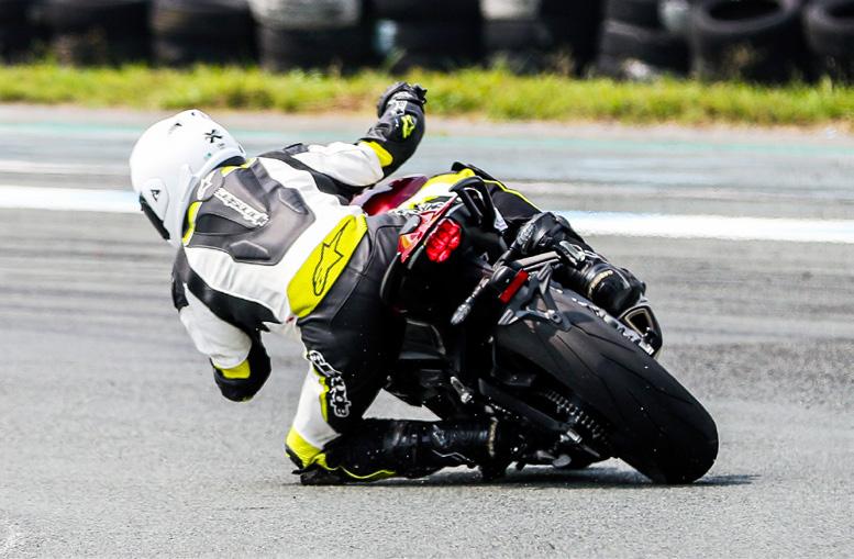 top of the bike so as not to upset the chassis. After only a couple of laps, I became comfortable with it and started to push for faster times. After a couple of sessions, I noticed that my body position was starting to improve. I hadn't been on the track for quite a while and that time away made my body stiff. Only after a few laps, I found that my body had loosened up and that I was getting faster and faster. I was only going at speeds under 100 km/h but the sensations felt very similar to big bike track riding.