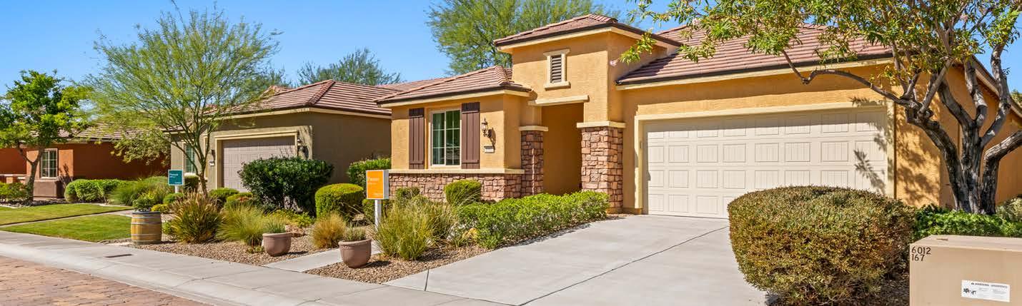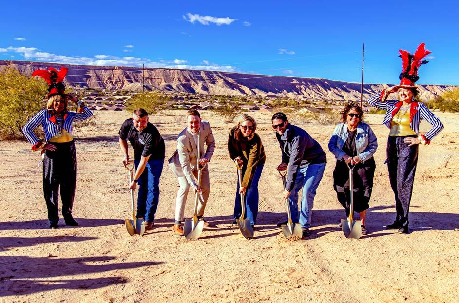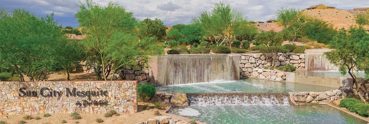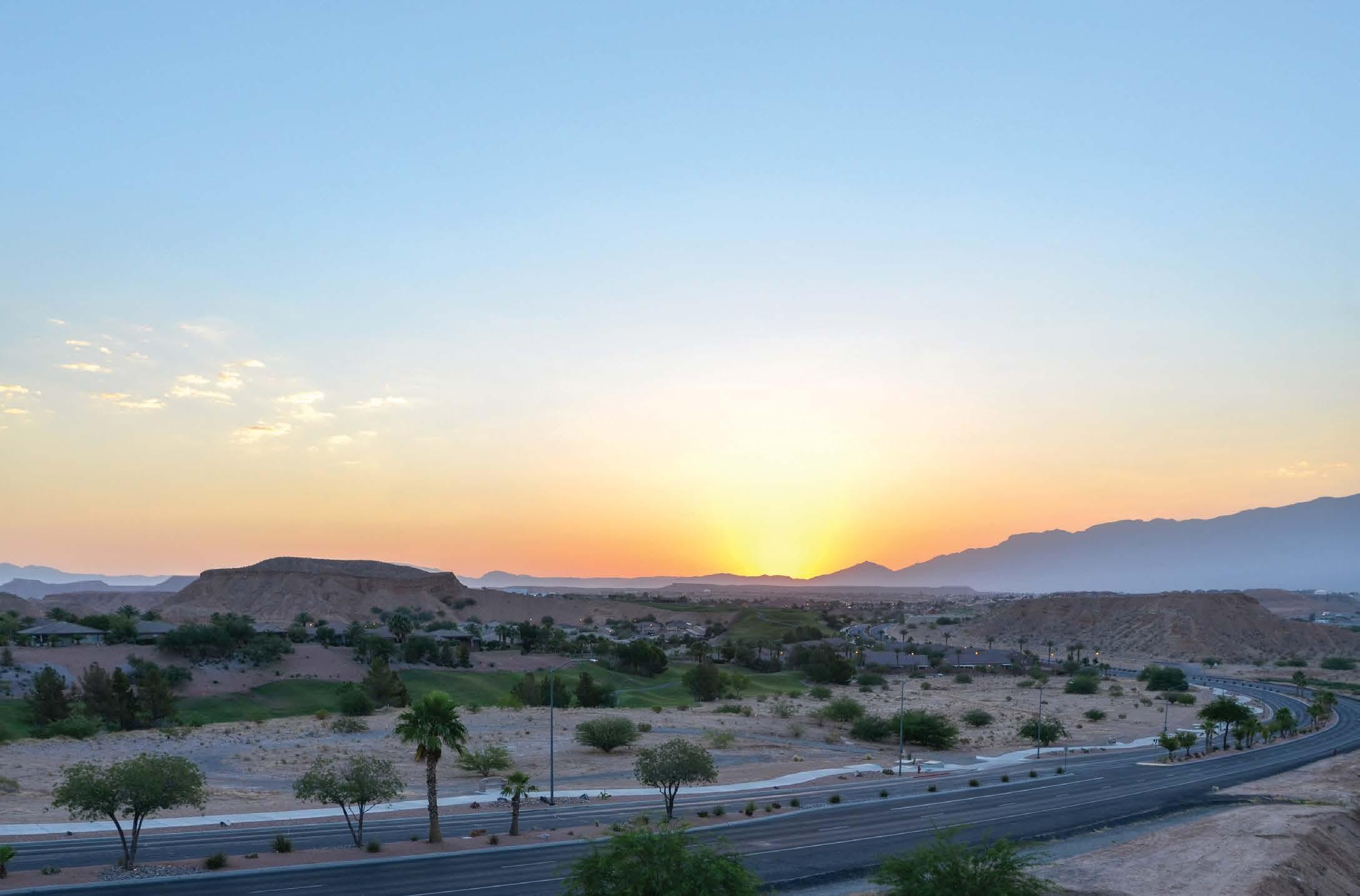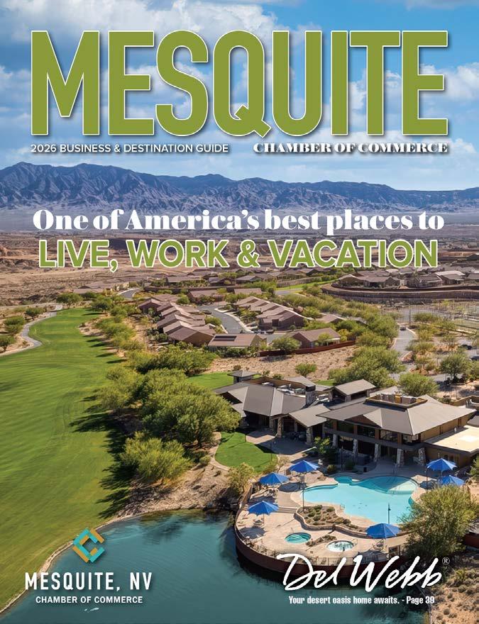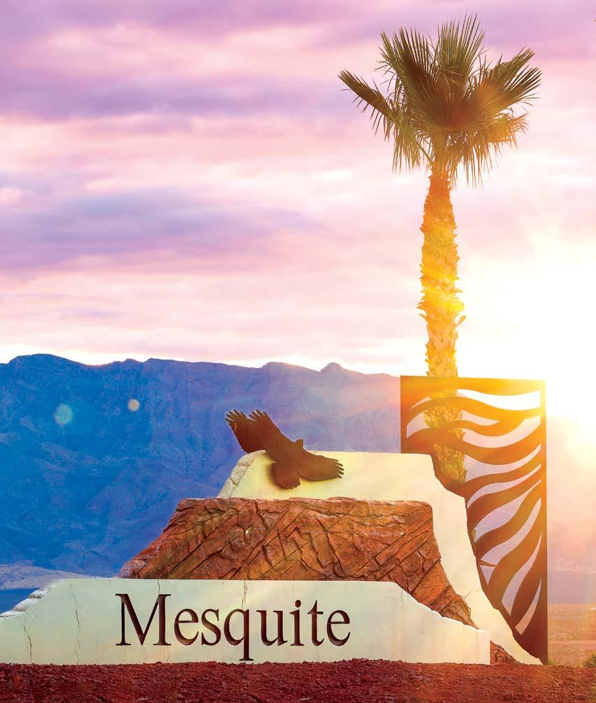 This year’s cover highlights the beautiful Sun City Mesquite community by Del Webb/Pulte Homes. Set against the Virgin Mountains, this aerial shot showcases thoughtfully designed homes, the fairway of hole #9 at Conestoga Golf Club, and the impressive Pioneer Center recreation facility. This 30,000-square-foot center offers indoor and outdoor pools, fitness facilities, sports courts, an 18-hole putting course, arts & crafts spaces, a library, and scenic walking trails. Pulte Homes continues to grow Mesquite with its newest community, Suntero, offering singlestory homes designed for comfortable indooroutdoor living in a stunning desert setting.
