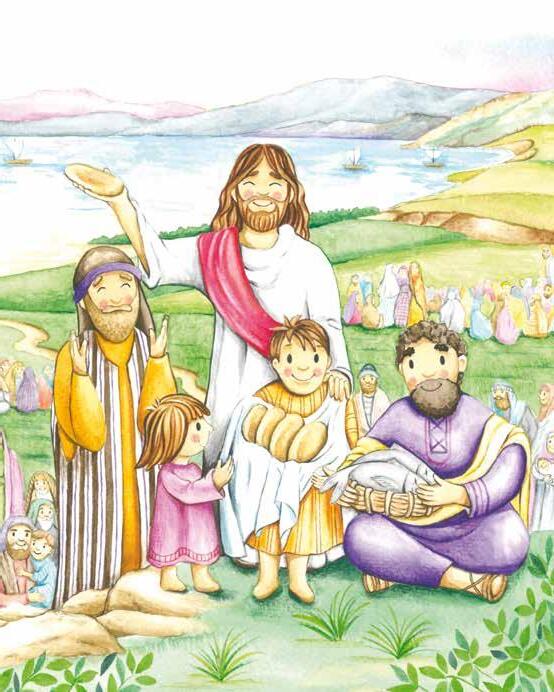 Los ayudantes de Jesús encontraron a un niño con cinco panes y dos peces. El niño compartió su comida.