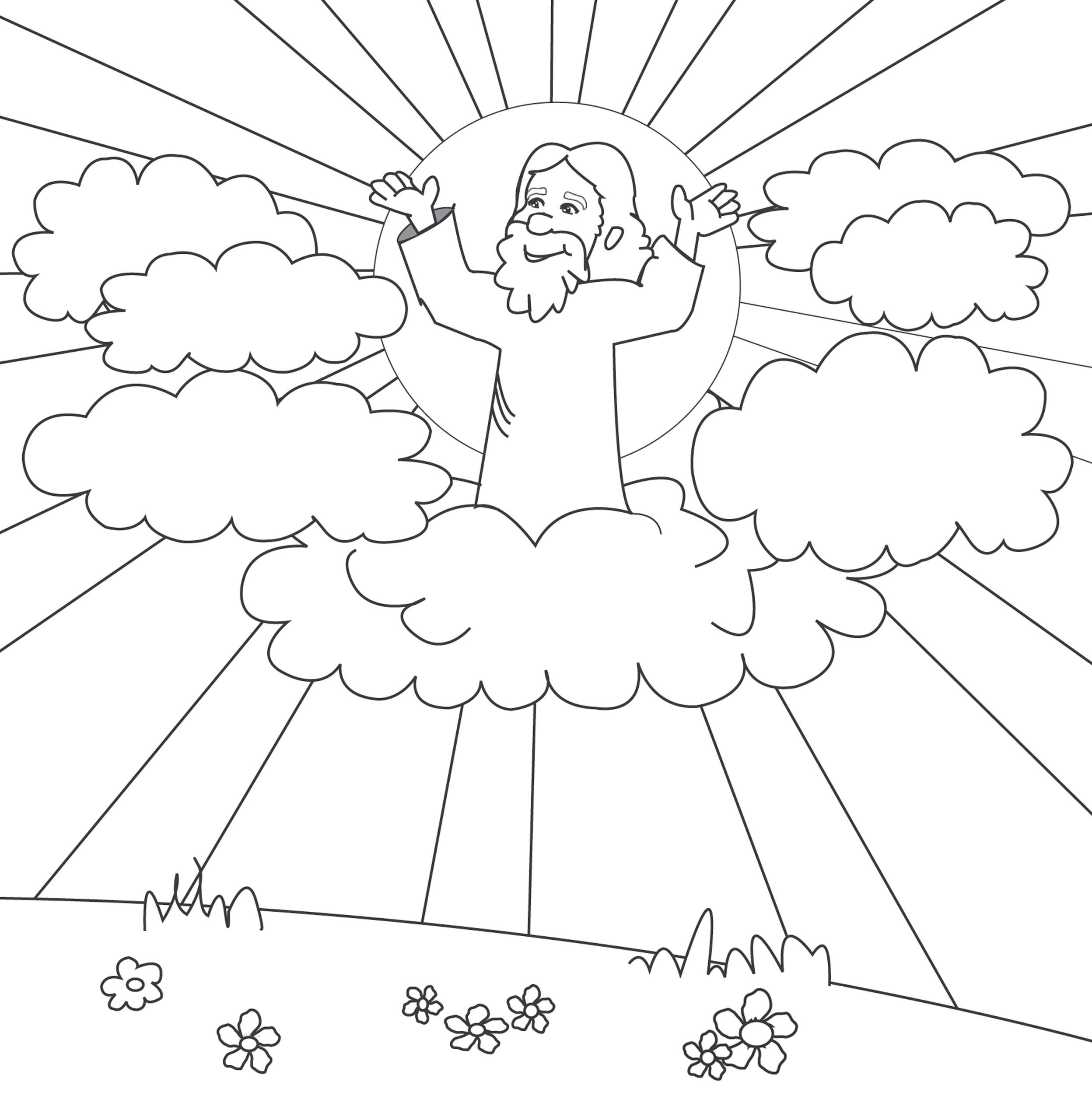 Kan jy vir Jesus tussen die wolke sien? Kleur die prent in.
