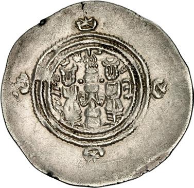 While most early Arab-Sasanian drachms have bism Allah in the obverse margin, this rarer type bears the shorter legend lillah, (‘For God’). Lillah in Arabic is visually similar to the Pahlawi APD legend commonly found on the Sasanian drachms of Khusraw II which this type copies. Making their new Arab-Sasanian drachms resemble pre-Islamic prototypes as closely as possible will have helped ensure their acceptance in the former Sasanian lands.
