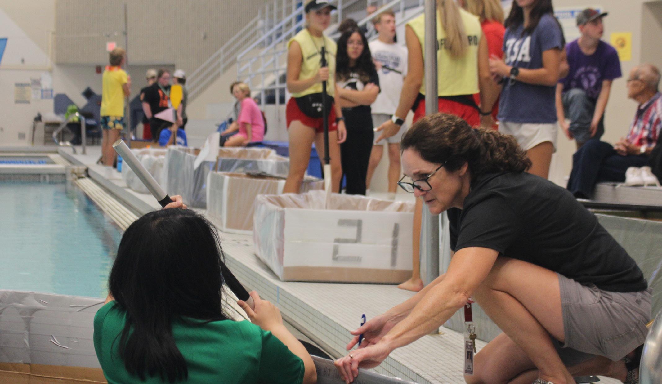 Science teacher Lisa Enneking helps a student at the annual physics boat race.