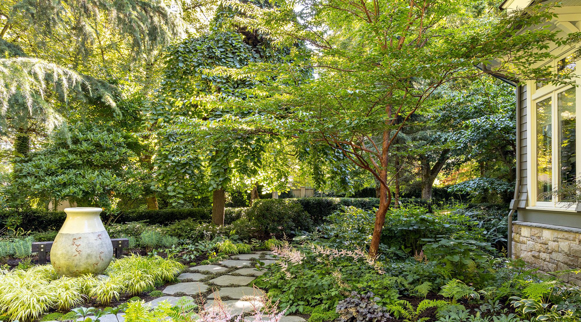 The plant palette has textured foliage, smaller flowers, and robust shade-tolerant species. The company uses organic landscaping methods to keep the garden healthy and without the use of chemicals. The client’s engagement in the landscape’s evolution has also been a driving force.