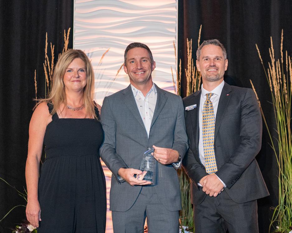 Matthew Montgomery from Rutherford Contracting Ltd. (middle) was presented the national award for Commercial Landscape Construction by Cindy Aardema from Finning (left) and Mark Perkes from Caterpillar (right) for the Town Square Development in Innisfil, Ontario.