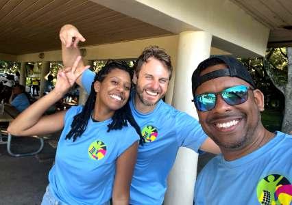 Doctors Natassjia Ragbeer (le ) and Chris Malinowski (center) had a great me volunteering as bartenders at the annual TATI Fish Fry which was held in Davie last weekend pictured here with Garfield Wright, President. – Contributed