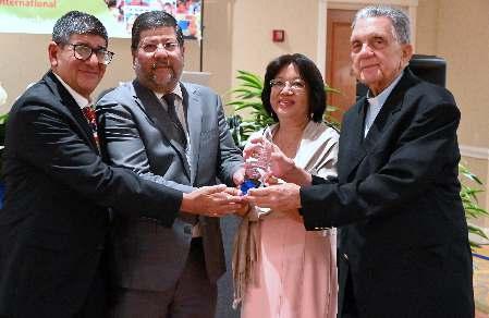 Humanitarian Award to Pishu Chandiram, posthumously, at the Friends of Good Shepherd Interna onal’s Fundraising Gala which was held last Saturday evening June 3rd,at the Double Tree by Hilton Hotel in Sunrise Florida. L-R: Denny Chandiram, Bobby Chandiram, Elaine Kong (FOGS Secretary), Most Rev. Charles Dufour. – Contributed