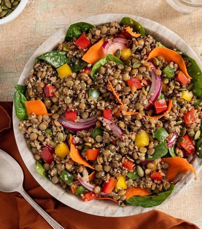 In a large serving bowl, add lentils, quinoa, carrots, bell peppers, spinach, onion and vinaigrette, and toss to coat. Chill or let sit at room temperature for at least 30 minutes before serving to allow flavors to develop Garnish with pepitasandserve.