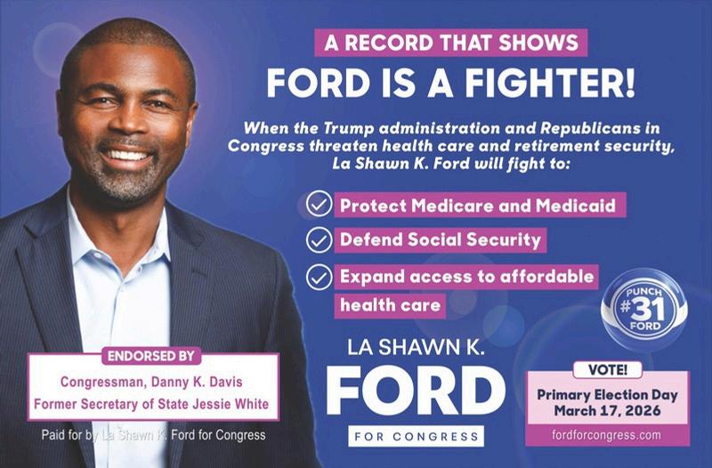 For more than two hours, candidates touted theirqualificationsandplanstobuildonFord’s contributions after he has served nearly 20 yearsinadistrictthatincludespartsofChicago’s Austinneighborhoodandthemunicipalitiesof Oak Park, Berwyn, Broadview, Cicero, Forest Park,LaGrange,HodgkinsandWestchester