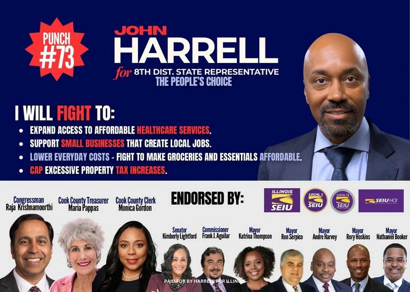 Harrell has been endorsed by Congressman Raja Krishnamoorthi, State Senator Willie Preston, State Representatives Kimberly Lightford, Monica Gordon and La Keisha Collins; Cook County Commissioners Michael Scott Jr, Bill Lowry and Frank Aguilar; and CookCountyTreasurerMariaPappas.