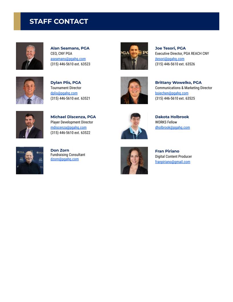 The Junior Tour has launched a comprehensive partner program to create access for every child, regardless of their financial background Additionally, the partner program will enhance the experience by providing "pro-style" tournament touches, high-quality gear, and memorable awards that turn a simple round of golf into an inspiring, lifelong memory Click here to learn more about the sponsorship program. Contact the section office for more information, or if you have a potential partner in mind