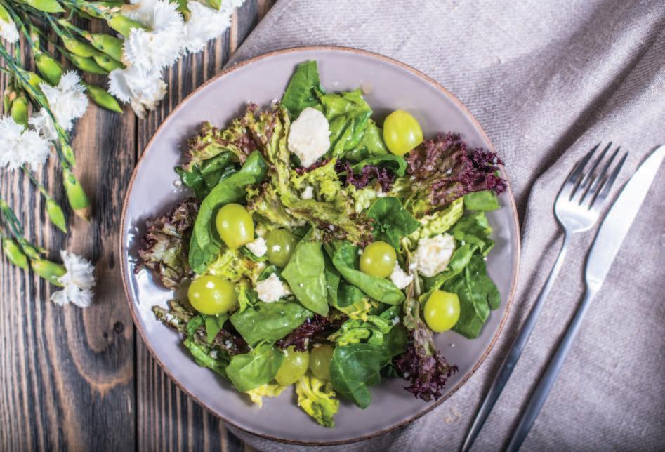 Mondare la misticanza eliminando le radici, lavarla accuratamente avendo cura di rimuovere ogni eventuale residuo terroso e asciugarla. Spiccare gli acini d’uva dal grappolo e sciacquarli a uno a uno. Spezzettare grossolanamente la feta.