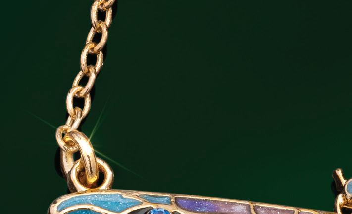 True artisanship in Austrian crystal and yellow gold. is necklace and earring set features gorgeous multicolored enamel paired with Austrian crystals and a yellow gold nish. Ask any jeweler and they’ll tell you it takes true artisanship to properly blend the blues and purples found in this enamel. While art nouveau dragon ies are hard to come by, we’re helping to repopulate their numbers with this artfully stylized depiction of some of nature’s smallest wonders!