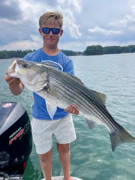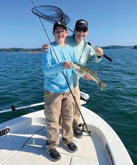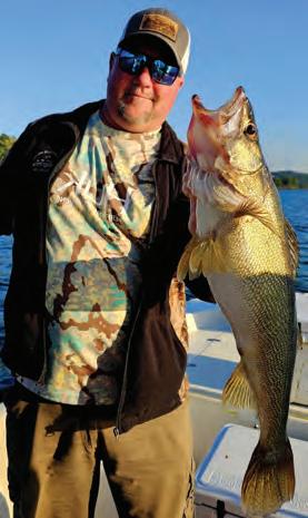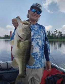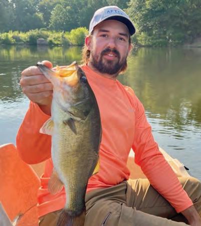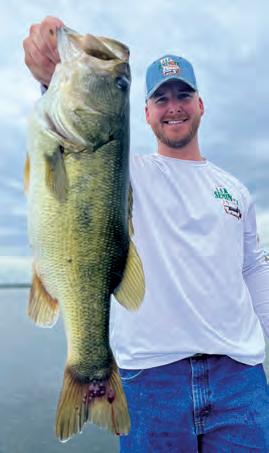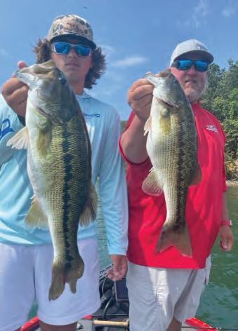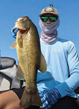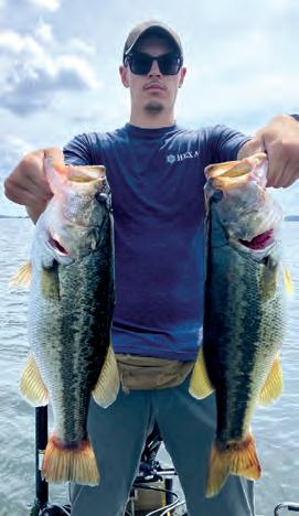 eptember is supposed to be the beginning of fall, but the reality— at least in the South—is the month is just a continuation of summer. Bass can be pretty tricky, but there are ways to target sh in cooler, deeper water. Dragging a Carolina rig is one of my favorites.You can play around with the size of the weight and the diameter of your leader line. In shallower 5- to 10-foot depths, a lighter weight can help your bait look more natural. I’d suggest ¼ to ½ ounce in that depth range. If you’re shing deeper water in 15 to 30 feet, shing a heavier ¾ to 1 ounce weight gets you down more quickly and allows you to cover bottom more e ectively.