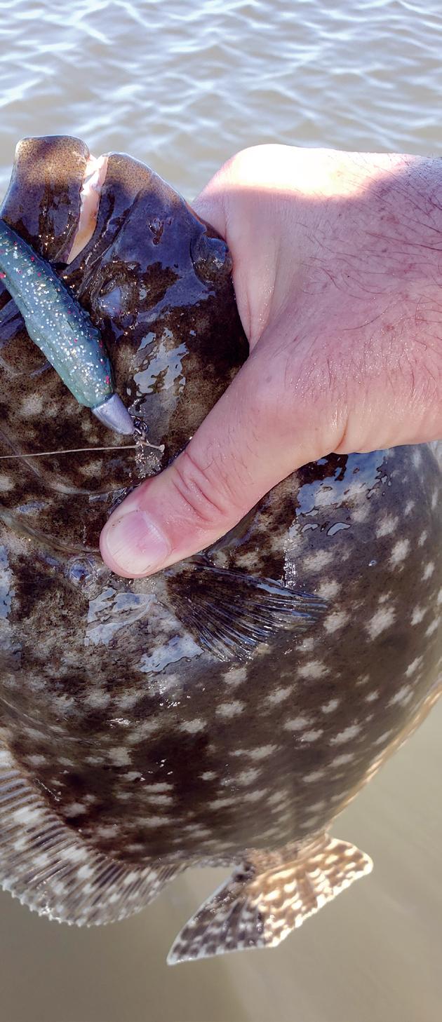 I will speci cally target ounder in these areas in September and early October. Since the spring migration, these tasty morsels have been working their way as far back in the marsh as they could get. With autumn around the corner, they start to congregate in these drains. Outside of the fall run, many anglers do not target these ground huggers. With the pressure light,