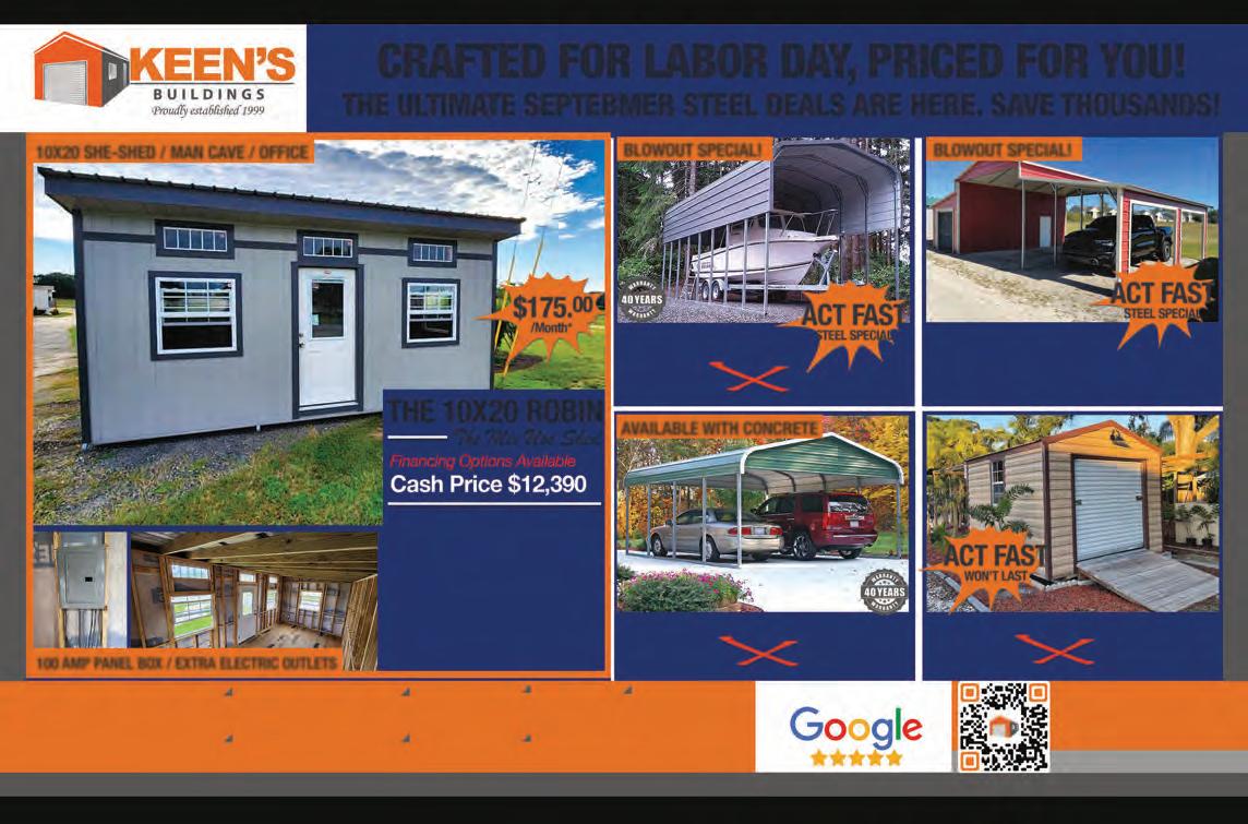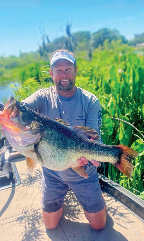 eptember is supposed to be the beginning of fall, but the reality— at least in the South—is the month is just a continuation of summer. Bass can be pretty tricky, but there are ways to target sh in cooler, deeper water. Dragging a Carolina rig is one of my favorites.You can play around with the size of the weight and the diameter of your leader line. In shallower 5- to 10-foot depths, a lighter weight can help your bait look more natural. I’d suggest ¼ to ½ ounce in that depth range. If you’re shing deeper water in 15 to 30 feet, shing a heavier ¾ to 1 ounce weight gets you down more quickly and allows you to cover bottom more e ectively.