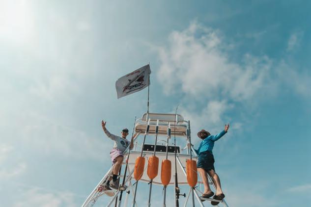 to get to bite, but they pull HARD! You have to have seriously strong connections because they will test every part of your tackle. ere’s one more sh that is almost as good table fare and that’s the white jolt head porgy. Same tactics, same everything; you just gotta nd them. ey are beyond delicious. You can troll all you want, but I’ll spend my time bottom shing for the best groceries and keep the light line out back for any wahoo, dolphin, kings or tuna that may cruise by. It pays dividends to jig up live cigar minnows and live sardines on the Sabiki or just purchase them for the light line. August and September are the months that wahoo, yellow n, dolphin, sail sh— you name it—are everywhere inshore following big schools of bait, and a live cig or sardine will de nitely get the bite. I would de nitely keep a live pitch bait ready on a circle hook on piece of %uorocarbon for the sail sh that’ll swim by the boat. Keep the thumping music, cooler slamming loud everything to a minimum if you want to have a shot at getting some of these sh to swim up to the boat. Fact: You’ll see more sh near the boat when you’re quiet, otherwise they will keep their distance and you probably won’t see them, and they’ll have their guard up if they do get near the boat.
