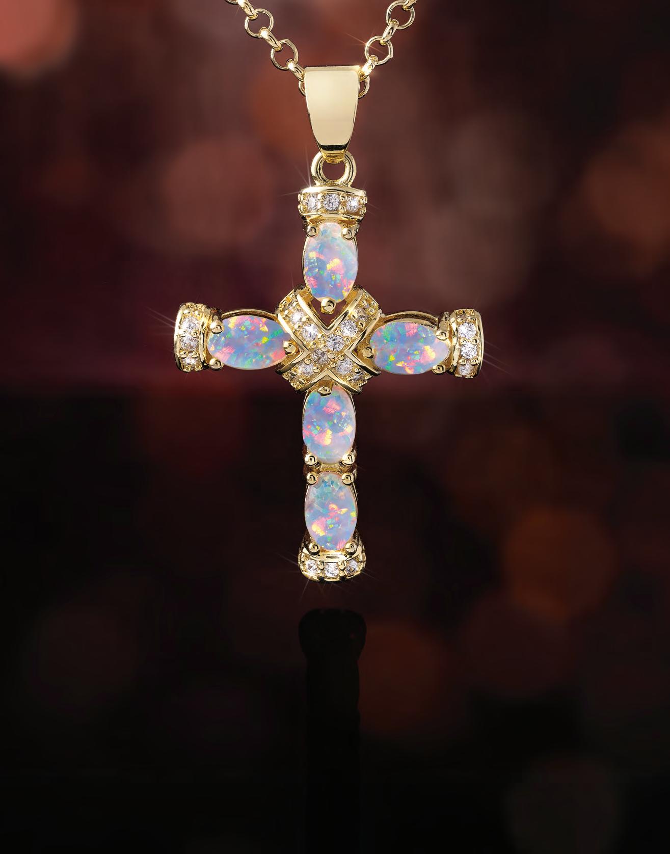 Using this story as inspiration, Stauer brings you the Opal Spirit Cross Pendant. With over 2 total carats of Kyocera lab-created opals set in .925 sterling silver encased in yellow gold, this pendant is a radiant celebration of beauty and craftsmanship. Each opal captivates with a kaleidoscopic dance of fiery oranges blending into oceanic blues, streaked with flashes of vibrant green that seem to come alive with every movement. "e shimmering opals are skillfully arranged to create an enchanting, otherworldly glow, embodying the spirit of hope and harmony.