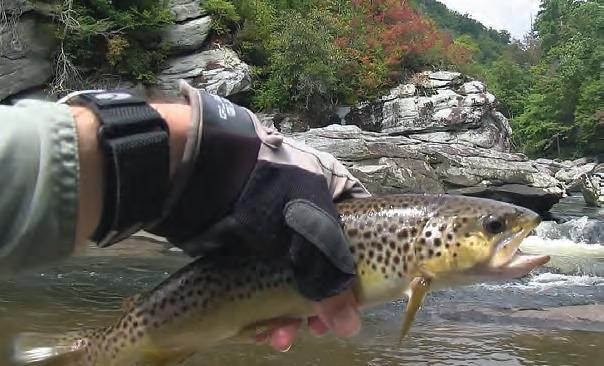 If Lake James is your comfy recliner, Linville Gorge is the rugged Adirondack chair that bites back. Known as the Grand Canyon of the East, this steep gorge is home to the Linville River, one of North Carolina’s best wild trout waters. e upper river holds wild and stocked rainbow, brook, and brown trout. Below Linville Falls, you’ll nd a backcountry adventure with native browns lurking in clear pools. Reaching prime spots requires steep descents, with some trails dropping 1,400 feet. e solitude and scenery reward every blister. Bring light tackle, stealthy casts, and plenty of water. Spring hatches bring trout to the surface, and a well-placed dry %y can tempt a wary sh. Remember your headlamp — climbing out in the dark is no fun.