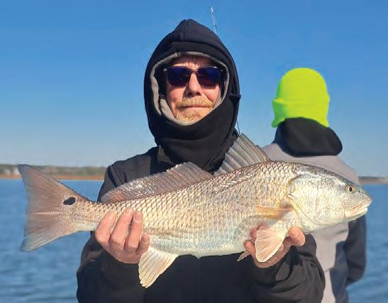 I was just telling my clients one day last week, a er catching a bunch of small trout and a couple of lady!sh, that the big uglies were probably going to show up in a few weeks and if they had a chance to come back out with me then that they may have a shot at catching some much larger !sh than the ones we had landed that morning. Just !ve minutes a er saying this I spotted something unusual about 500 yards up the at. It was exactly what I had just been talking about- a 300 !sh school of 30 to 50-pound black drum.
