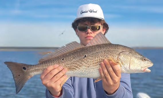 e !sh in this big school were happy-tailing and waking as they pushed their way down the at. We eased up to them, cast our shrimp in their direction, and as you !gured, the battles were on. All three anglers were hooked up to huge drum that had absolutely no respect for them. Drags screamed, rods doubled over, and dozens of yards of line dumped o their reels. Grunts and groans were heard between laughter and smiles as they worked to tire these beasts. e boat deck looked like a country bar dance oor as anglers shu ed and two-stepped under and over each other in an e ort not to lose their prized catches.