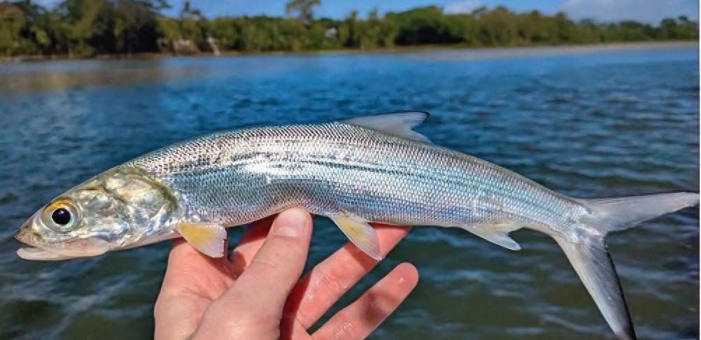 A live sardine or a live cigar on the correct jig has a life expectancy of just a few seconds. !is is where it pays o to nd a shop that carries beautiful (frozen) bait. When you open up a box of frozen cigar minnows and see beautiful, clear eyes and yellow on the tails you’ve got a box of bites in your hands. If you have a frozen box of cloudy-eyed, mushy cigar minnows, then you might not nd what you’re looking for on the bottom or on the light line. If you nd large schools of cigars or sardines, it o en pays to spend a little bit of time to catch them. !is always results in bites, whereas the frozen minnows work most of the time.