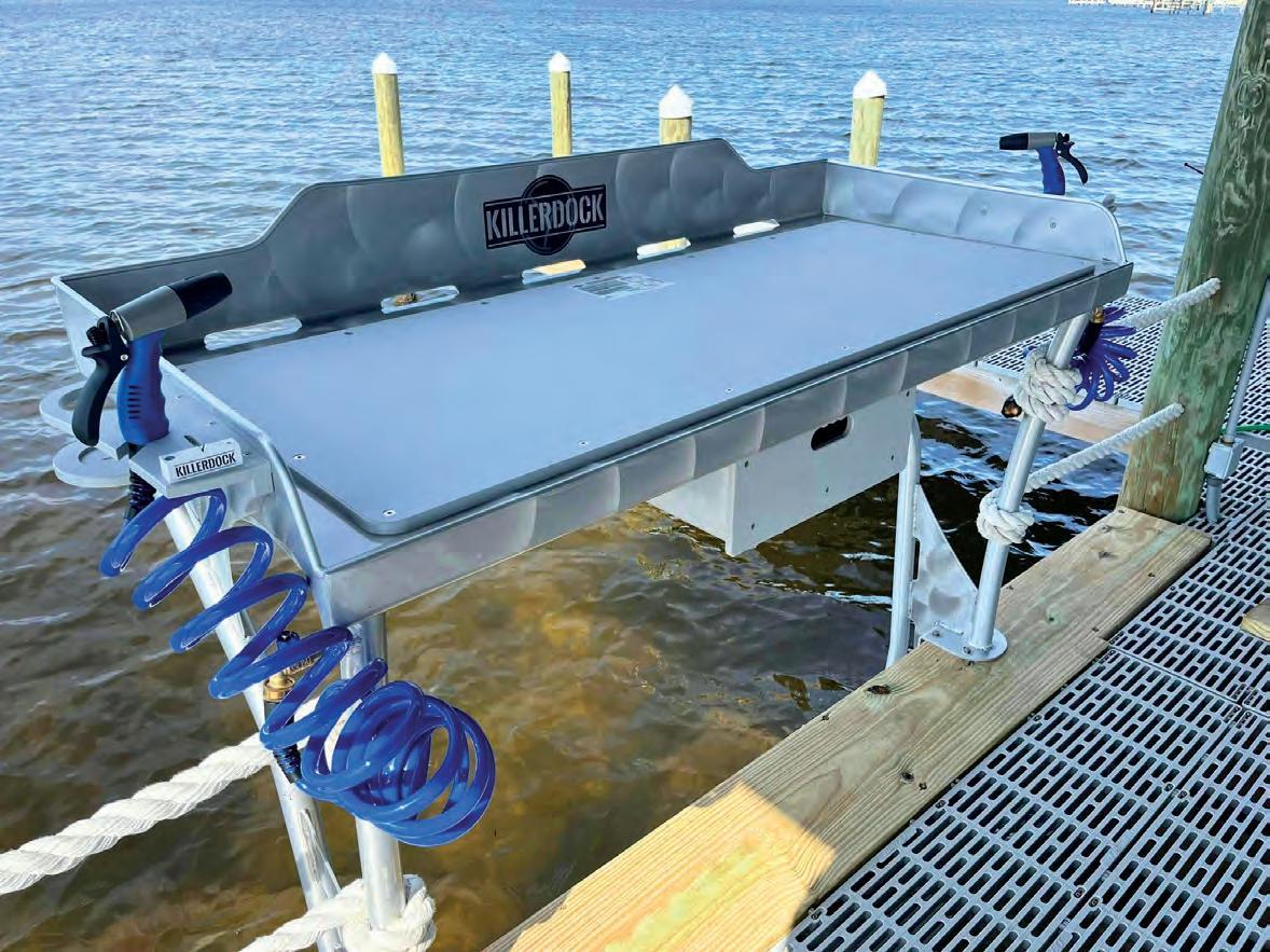 This is the time of year to nd the wall of warmer water and get the wahoo bite going. All of the water nearshore is cold and where the 68- plusdegree water meets that cold water can be an excellent spot for targeting wahoo. is is a great time of year to target wahoo during the rst hour or two of your trip using high speed trolling. You can cover a lot of ground high speed trolling, which speci cally targets wahoo. Once the sun has been up for a few hours your chances at a wahoo bite diminish unless it’s an overcast or rainy day. Wahoo regulate the amount of sun they take in by going deeper as the sun rises, so midmorning is a good time to change tactics.
