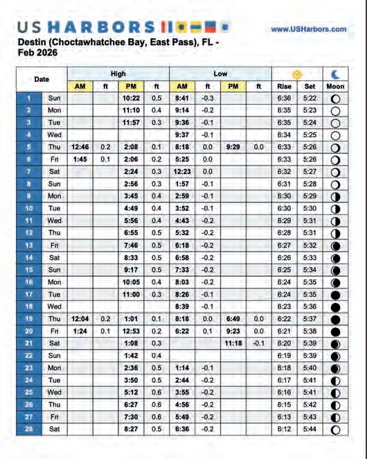 Winter has settled in by February. Water temperatures hover in the upper 40s to low 50s, especially a er a strong north wind. !at cold pushes bait and game sh into tighter zones, turning miles of water into a handful of high-percentage spots. If you can nd warmth, you can nd sh.