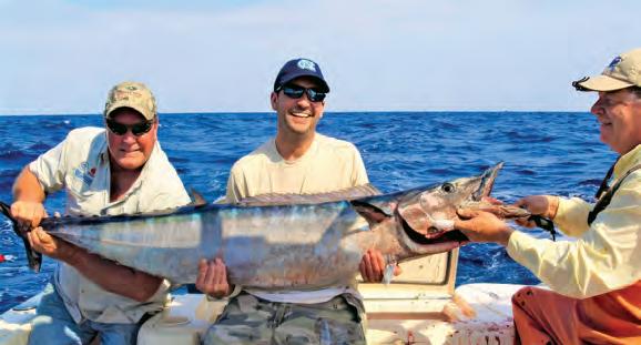 This is the time of year to nd the wall of warmer water and get the wahoo bite going. All of the water nearshore is cold and where the 68- plusdegree water meets that cold water can be an excellent spot for targeting wahoo. is is a great time of year to target wahoo during the rst hour or two of your trip using high speed trolling. You can cover a lot of ground high speed trolling, which speci cally targets wahoo. Once the sun has been up for a few hours your chances at a wahoo bite diminish unless it’s an overcast or rainy day. Wahoo regulate the amount of sun they take in by going deeper as the sun rises, so midmorning is a good time to change tactics.