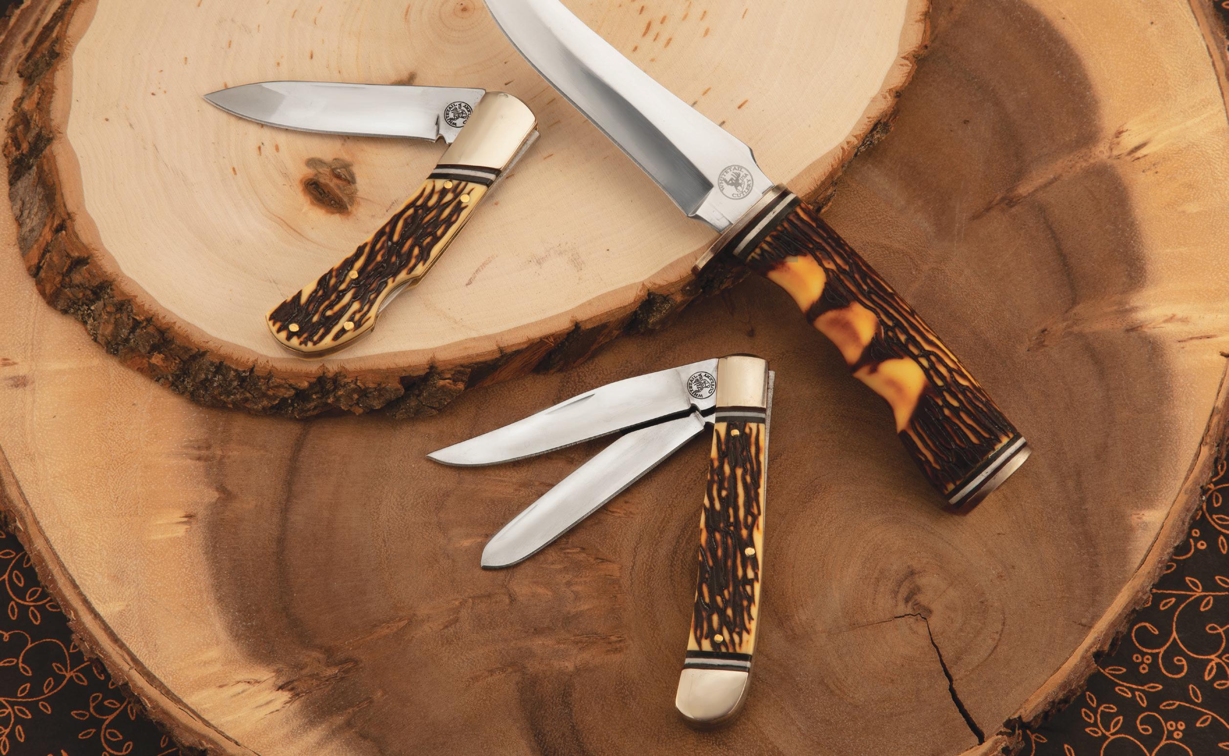 • 3-piece set: 9" overall fixed knife with 5" blade; 4 ¹⁄8" trapper knife with two 3 ³⁄8" blades; 4" overall lockback knife with 3" blade • Stainless steel blades with antler patterned resin handle • Comes in decorative display box