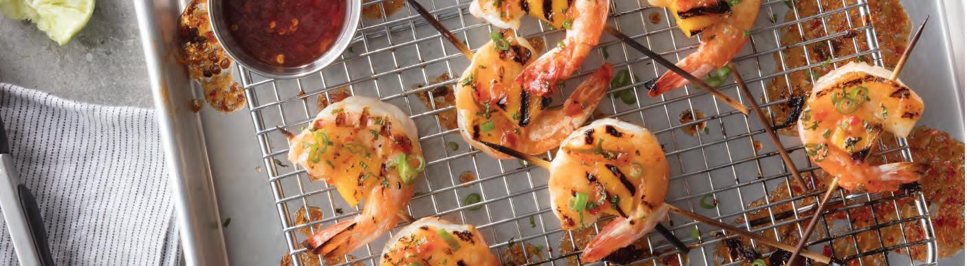Soak the bamboo skewers in water for at least 1 hour (this reduces the chance of the skewers burning). Combine the sweet chili sauce, lime juice, ginger and mint in a small bowl. Slice the scallions and set aside. On a clean surface, place a mango cube in between the tail and top of a shrimp. Insert the bamboo skewer through the shrimp and mango. Repeat the skewering process until all shrimp are skewered and store in the refrigerator until ready to grill. Preheat a charcoal grill (or indoor grill pan) and cook the shrimp and mango skewers. When the shrimp is close to being cooked through, glaze with the sweet chili sauce. Sprinkle with the sliced scallions and serve.