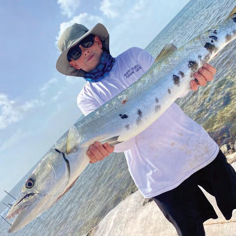 July and August will be the hottest months of the year. !e wahoo and yellow nn will be everywhere and nowhere they should be. For example, you could go up and down the edge of the break and not nd a wahoo or a yellow n anywhere, but the guy slow trolling a menhaden for king mackerel 10 miles o# the beach catches a 100-pound wahoo or the guy 30 miles o# the beach light lining a pin sh while bottom shing catches a 50-pound yellow n. None of it makes any sense this time of the year, except one thing... nd the bait, nd the sh. !e same thing applies to bottom shing. !is is the time of year to search for big stacks of bee liners, cigar minnows, and sardines. Keep an eye on the recorder when you’re running to wherever you’re going, and if you see a big stack of bait on the surface, take a minute to check it out. If that stack of bait happens to be near pretty bottom, there’s a good chance it’s a good place to sh. !is is the time of year when it is especially productive to jig live cigars and sardines and put them back out.