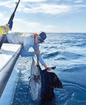 Once you’ve hooked into a mahi, slow the boat but keep it in gear while you clear the other trolling lines. Bring the hooked sh close to the boat, but leave it swimming in the water as it will act like a chumbag to bring his buddies up to casting range. Grab your spinning rods with 50-80# leader and an 8/0 j hook, toss on a live or chunk of bait and cast out behind the hooked sh. Let back, occasionally stopping the line with your nger and giving it a little twitch and then continuing to free-line it back. When you get a bite, give the sh a few seconds to eat awnd then close your bail and reel. Once you have all your rods hooked up with sh, start taking them into the boat one at a time and casting back into the school, holding multiple hooked sh in the water as you start rotating them out.