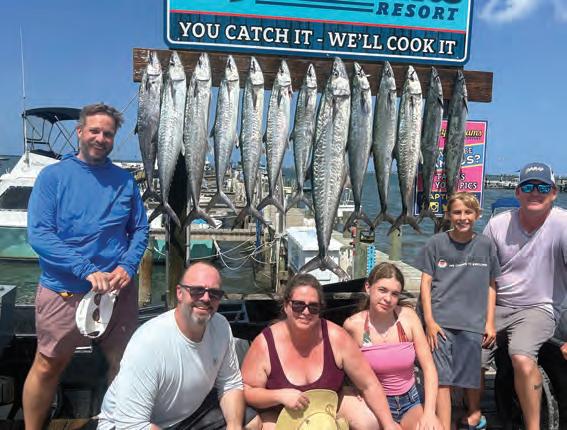 July and August will be the hottest months of the year. !e wahoo and yellow nn will be everywhere and nowhere they should be. For example, you could go up and down the edge of the break and not nd a wahoo or a yellow n anywhere, but the guy slow trolling a menhaden for king mackerel 10 miles o# the beach catches a 100-pound wahoo or the guy 30 miles o# the beach light lining a pin sh while bottom shing catches a 50-pound yellow n. None of it makes any sense this time of the year, except one thing... nd the bait, nd the sh. !e same thing applies to bottom shing. !is is the time of year to search for big stacks of bee liners, cigar minnows, and sardines. Keep an eye on the recorder when you’re running to wherever you’re going, and if you see a big stack of bait on the surface, take a minute to check it out. If that stack of bait happens to be near pretty bottom, there’s a good chance it’s a good place to sh. !is is the time of year when it is especially productive to jig live cigars and sardines and put them back out.