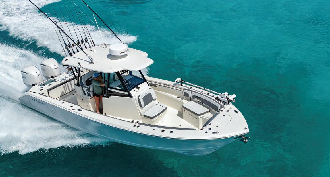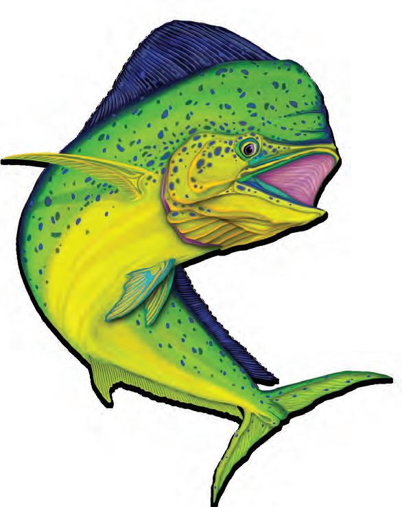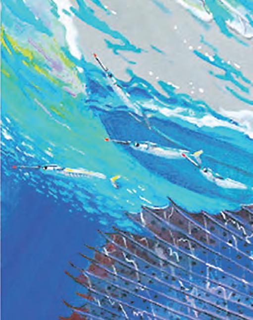 Tere were birds diving, porpoise rolling and he y yellow n tuna skyrocketing like Fourth of July reworks. Both on the water and in the boat, the energy was palatable. With one angler on the bow ready to cast a top water plug into the fray and me in the stern with ready to deploy live bait, the boat throttled back. !e plug went ying, meanwhile I simply dropped my bait behind the boat and started freelining. Almost instantly the plug was blasted in the air but not connecting. Meanwhile, I tossed a handful of baits o the back of the boat. By now the fray had subsided but the sh were clearly still looking for an easy meal. 50 feet behind me one of the chummers was blasted overhead by a 150 pound yellow n who was skyward bound a er it. Just below I could see my bait franticly swimming as another engulfed it, leading to a great battle before releasing the 100 pound class sh.