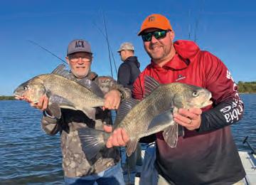 e !sh in this big school were happy-tailing and waking as they pushed their way down the at. We eased up to them, cast our shrimp in their direction, and as you !gured, the battles were on. All three anglers were hooked up to huge drum that had absolutely no respect for them. Drags screamed, rods doubled over, and dozens of yards of line dumped o their reels. Grunts and groans were heard between laughter and smiles as they worked to tire these beasts. e boat deck looked like a country bar dance oor as anglers shu ed and two-stepped under and over each other in an e ort not to lose their prized catches.