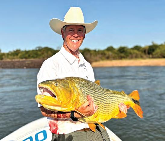 e Salminus Brasiliensis is certainly not related to salmon, but is of the order Characiformes which includes many species— notably vampire-fanged payara and modern cinema star piranha in South America and tiger sh in Africa. Redundantly named the golden dorado (dorado means “golden” in Spanish), it’s immensely powerful, acrobatic—and magni cently beautiful.