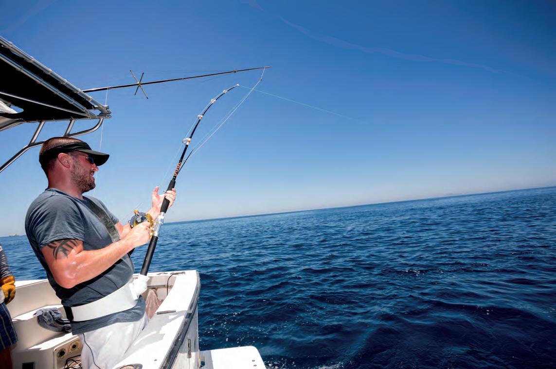 e group set out early Friday morning. By 9 a.m., a!er a couple of hours of shing, they started noticing signs of a school of tuna breaking the surface of the calm waters. Suddenly, the right rigger snapped down with a forceful bite, signaling the start of Esslinger’s showdown against his monstrous tuna.