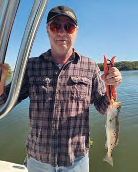 PRO TIP: Have a few of your rods rigged up with various sizes and pro!les of lures on them. I like to have a 3-inch paddletail, an arti!cial shrimp and a 4- to 5.5-inch jerk bait ( uke) rigged up when I can’t determine what bait is around. Try all three sizes and pro!les of lures until you !gure out what the !sh in the area are feeding upon.